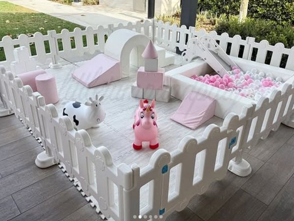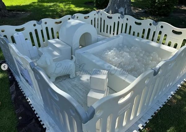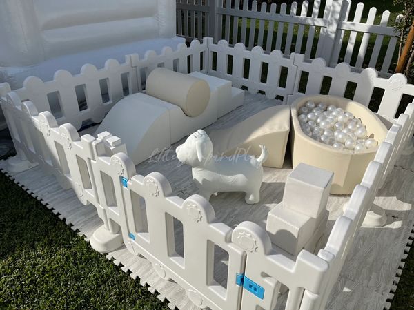 Included: Mats, Gates, 3ft Ball Pit, 3 Piece Climber, 2 Bouncy Animals, 6 Small Blocks, 6 LEGOs, Slide, White Clear Balls.